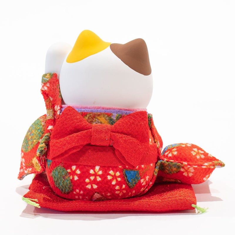 錦彩ちりめんの着物を着た招き猫です。招き猫は幸運やお金を招くとされる日本の縁起物で片手を挙げている猫の置物です。