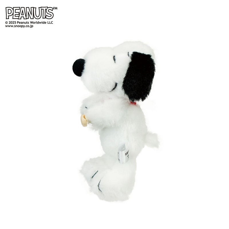 手のボタンをゴムにかけ、様々なところに”ぎゅっ!”と取り付けて楽しめるスヌーピーのぬいぐるみです。