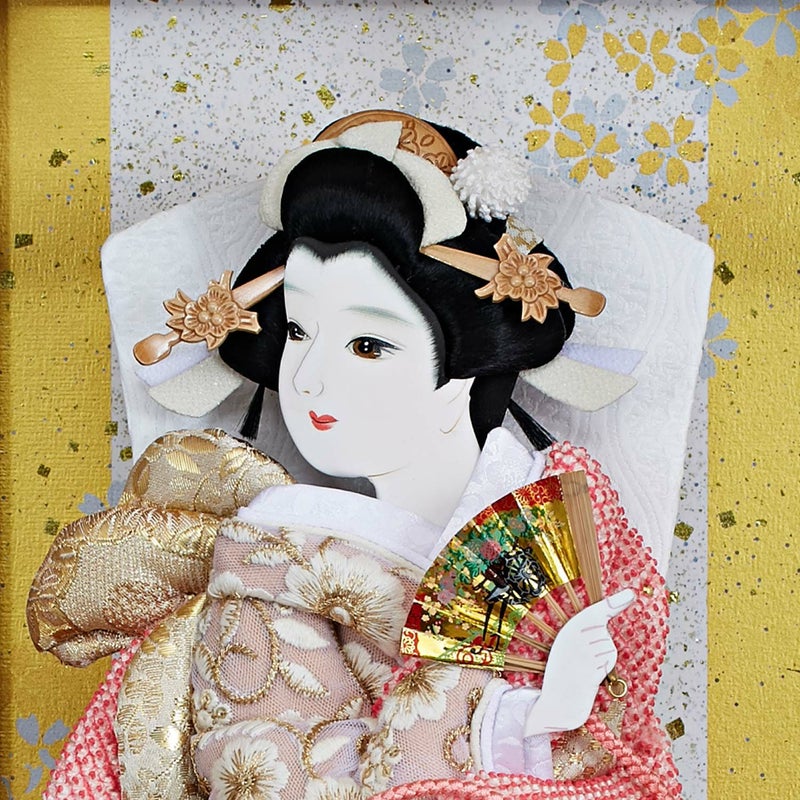 淡い色合い衣裳の羽子板には「鹿の子」絞りを用いました。
