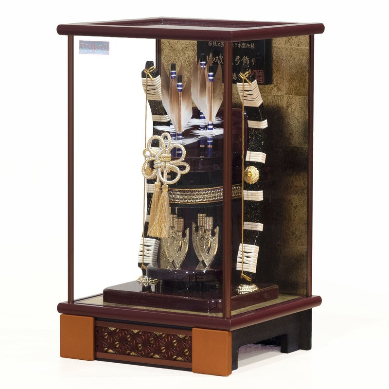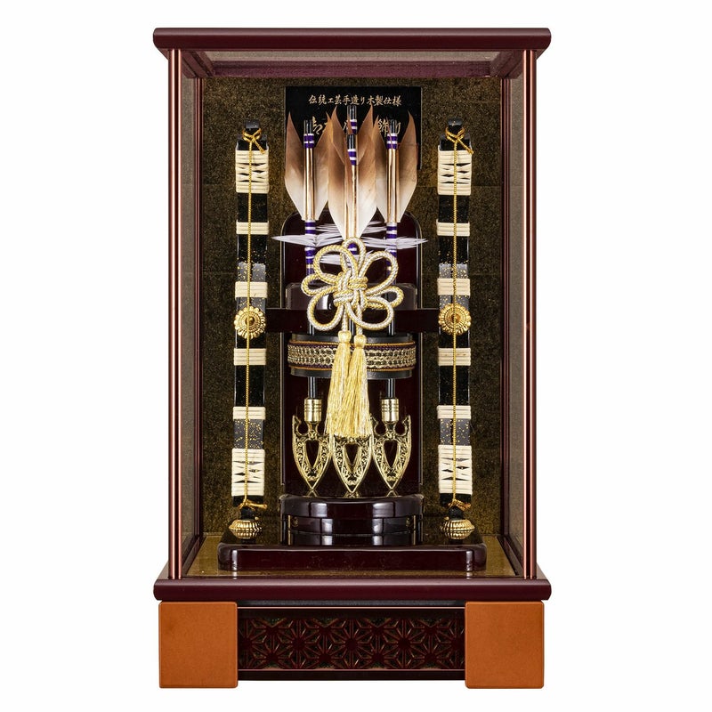 マホガ二塗のアクリルケースに4本矢をセットした破魔弓ケース飾りです。