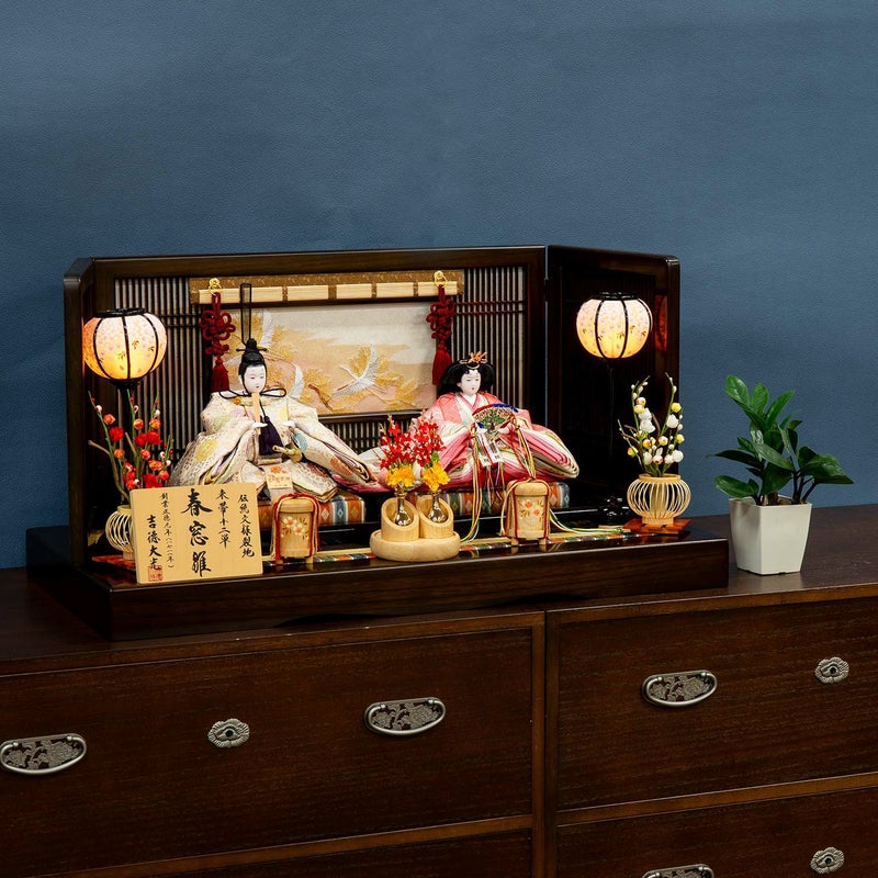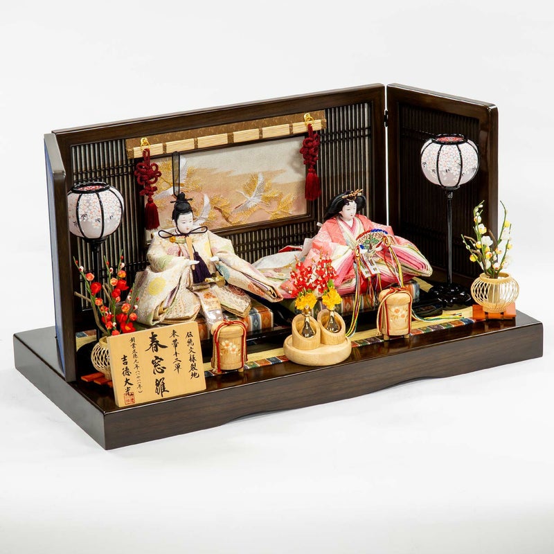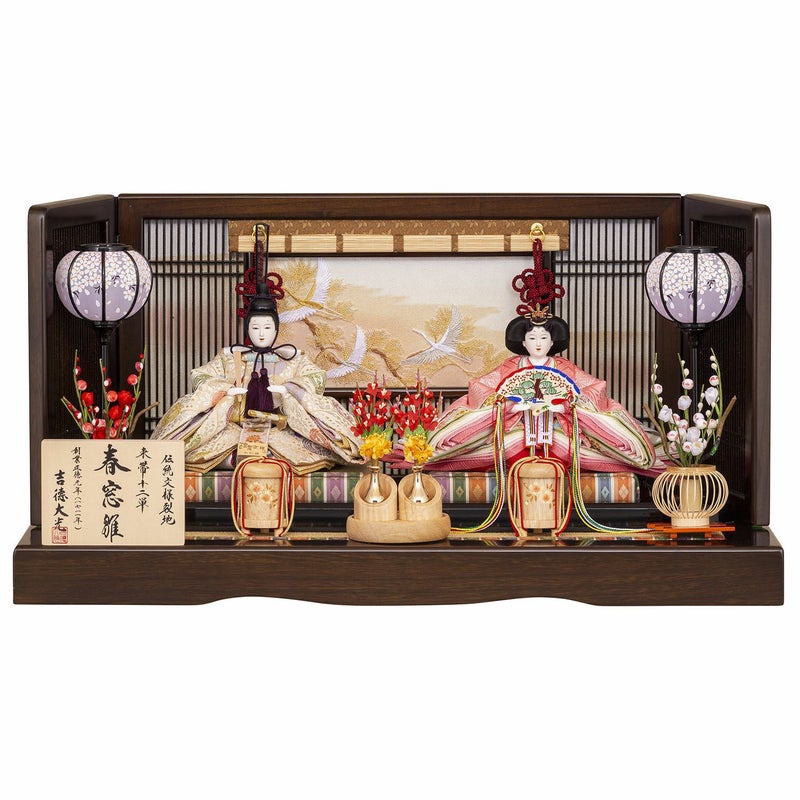 伝統の技に現代感覚を巧みに融合させた吉徳を代表とするベストセラー。背景の格子屏風と鶴の刺繍が印象的な雛飾り。