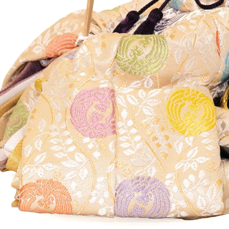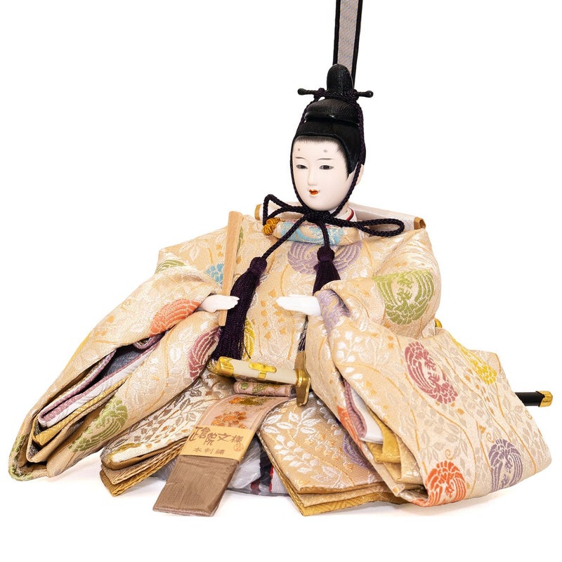 ■女雛は雲立涌に唐花丸文様を織り出した金襴衣裳を着せ付け。