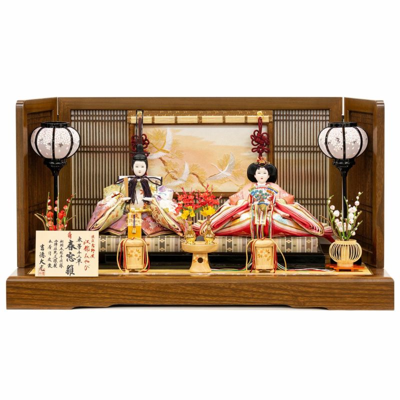 屏風に施した鶴の刺繍が印象的な、春窓雛親王飾りです。
