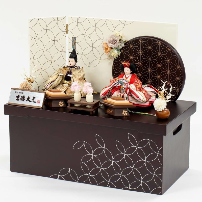 四角と円形を組み合わせたデザイン屏風が印象的な収納箱飾り。