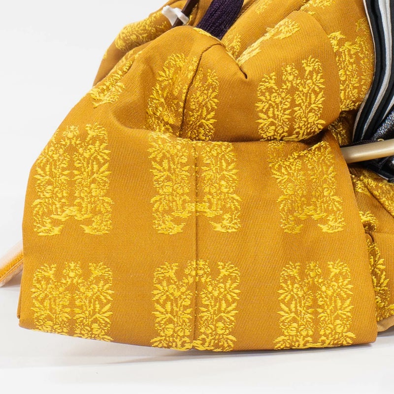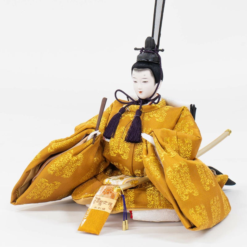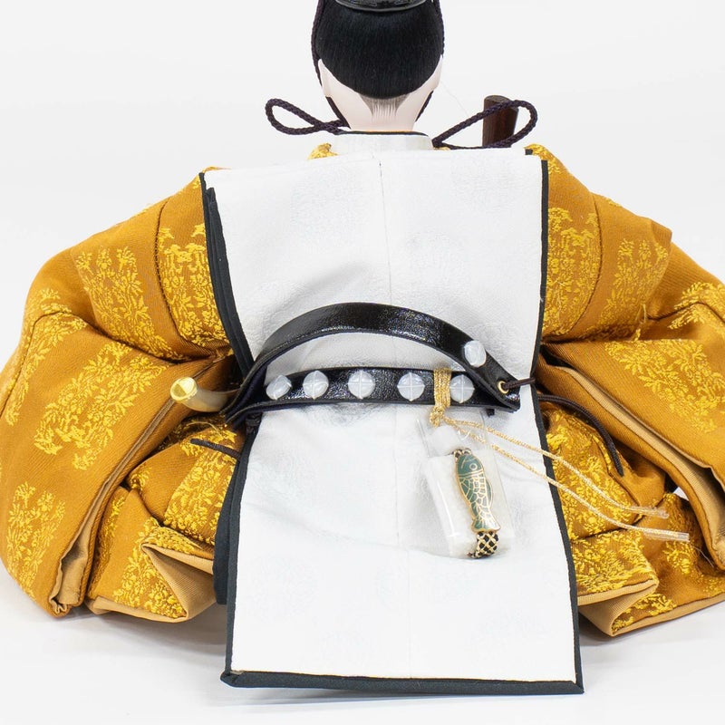 ■男雛には天皇のみが着用される“黄櫨染桐竹鳳凰文(こうろぜんきりたけほうおうもん)” の御装束を写した正絹裂地を本式に仕立て丁寧に着せ付け