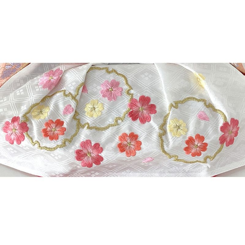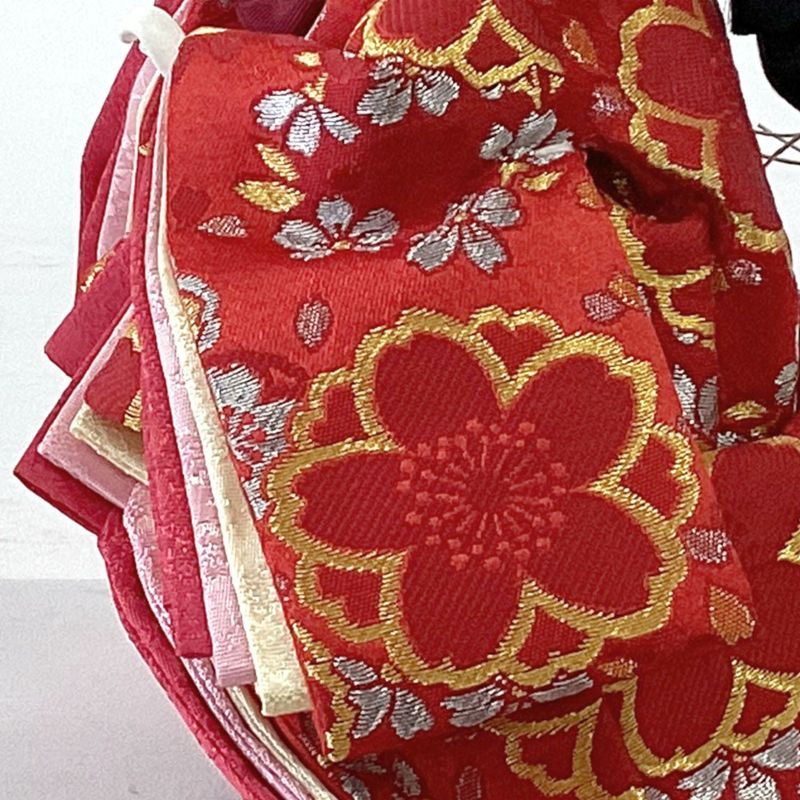 明るい木目調の収納箱に様々な花柄が描かれた衣裳を着せ付けたお人形がより一層映える引き出し式収納五人飾りです。人形の細部にもこだわり、女雛の裳には桜柄を様々な色合いの刺繍で仕上げました。道具には唐草文様を施しました。唐草は生命力が強く、また、途切れることなく伸びていくその様子から“子孫繁栄”“長寿”の意味があります。