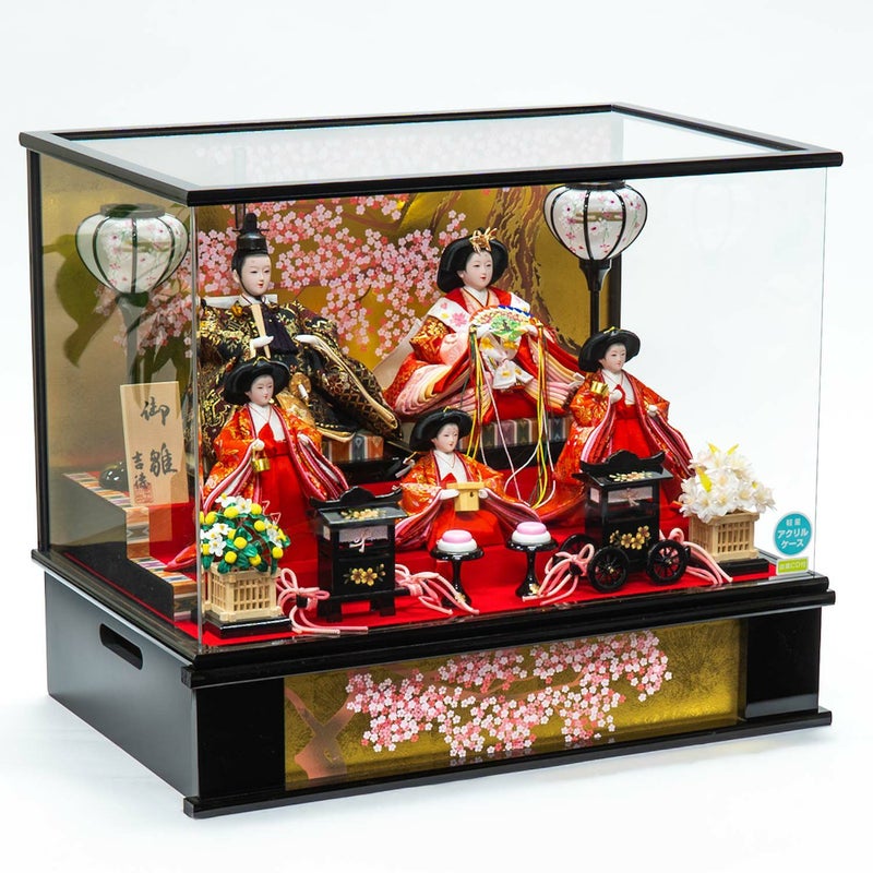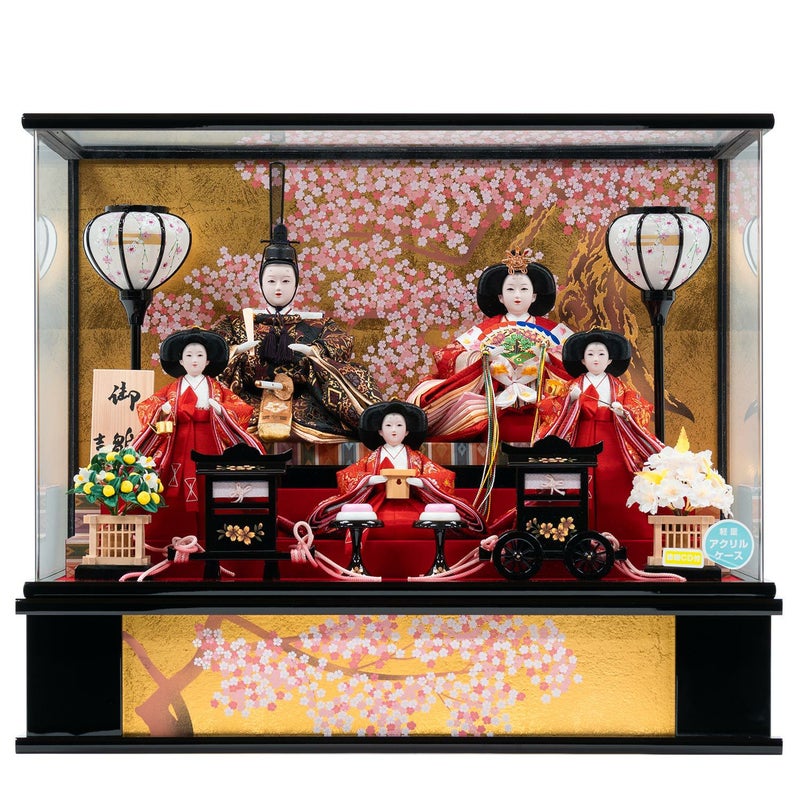 満開に咲き誇る桜を背景に用いた五人ケース飾り。