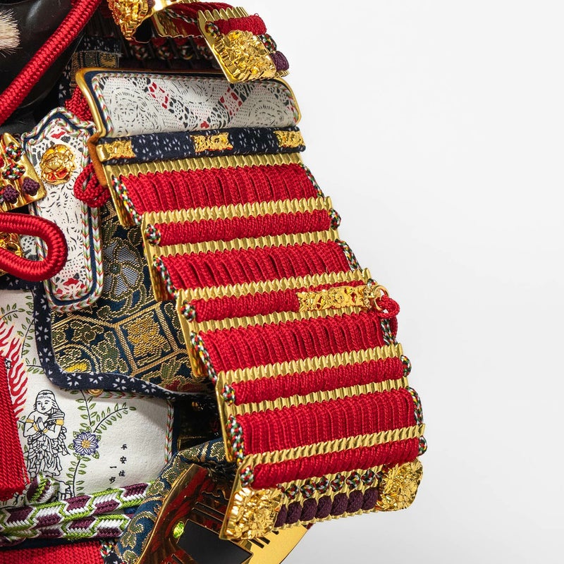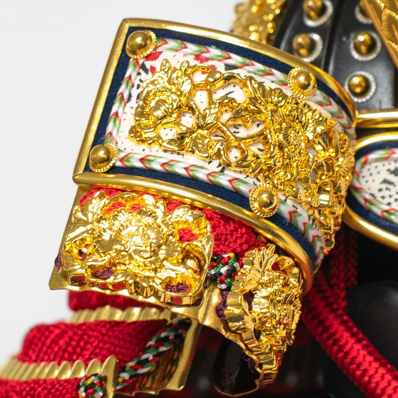 基本的には五月の節句飾りを目的に作った甲冑のため、金箔や金具を多用した豪華な雰囲気のものが多く、飾り金具の柄もおめでたいもの、出世を願うもの、健やかな成長を願うものと全て吉祥の図柄を基本としています。