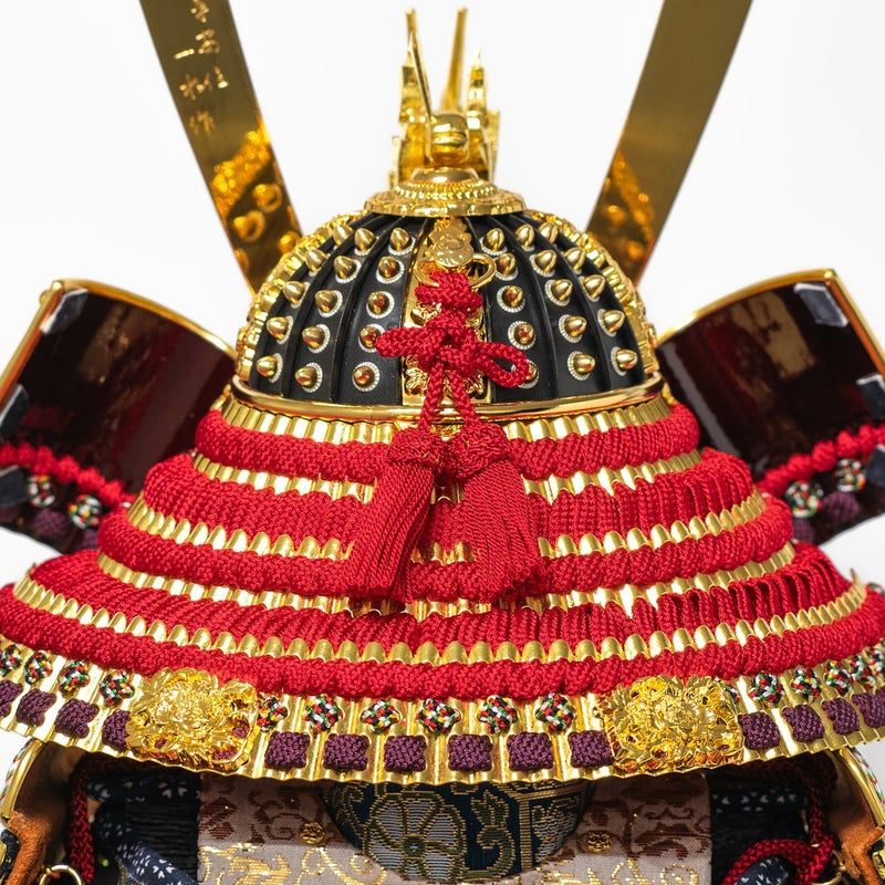 兜の鍬形純金鍍金仕上、龍頭は木彫金箔仕上、兜鉢は合わせ鉢仕様。
