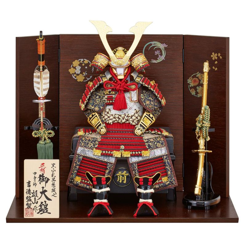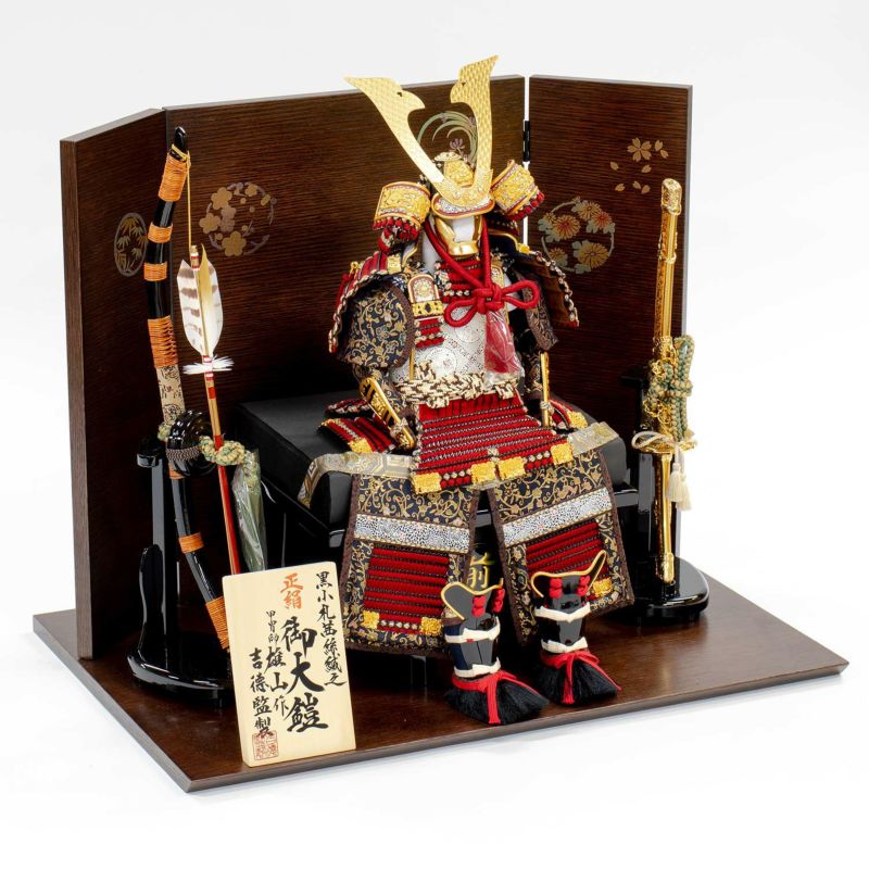 ■甲冑師・雄山作の新しいタイプの黒小札正絹茜絲縅、5号サイズの鎧飾り。