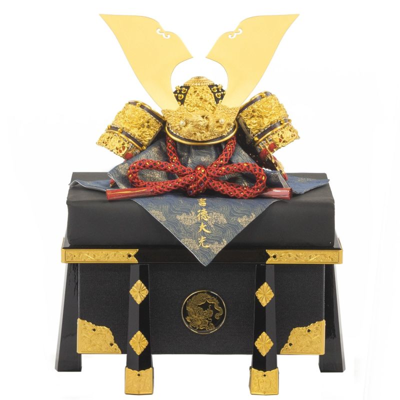 美しい加賀蒔絵と箔押を組み合わせた屏風に金小札赤絲縅の兜をセットした「飛龍之兜飾り」。