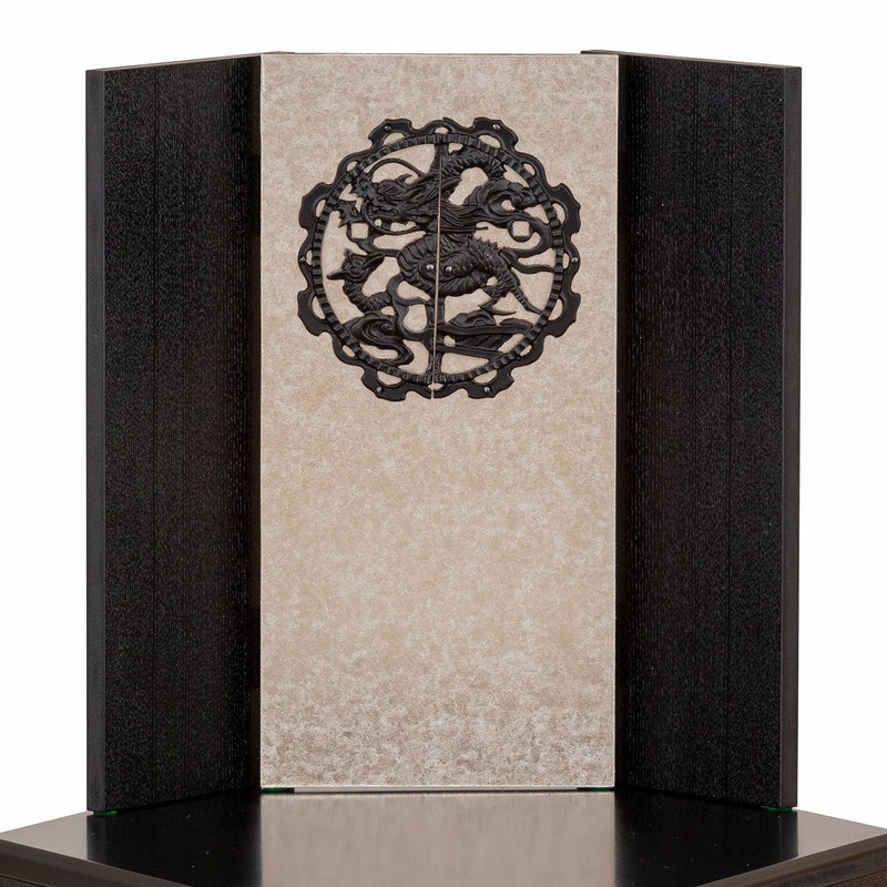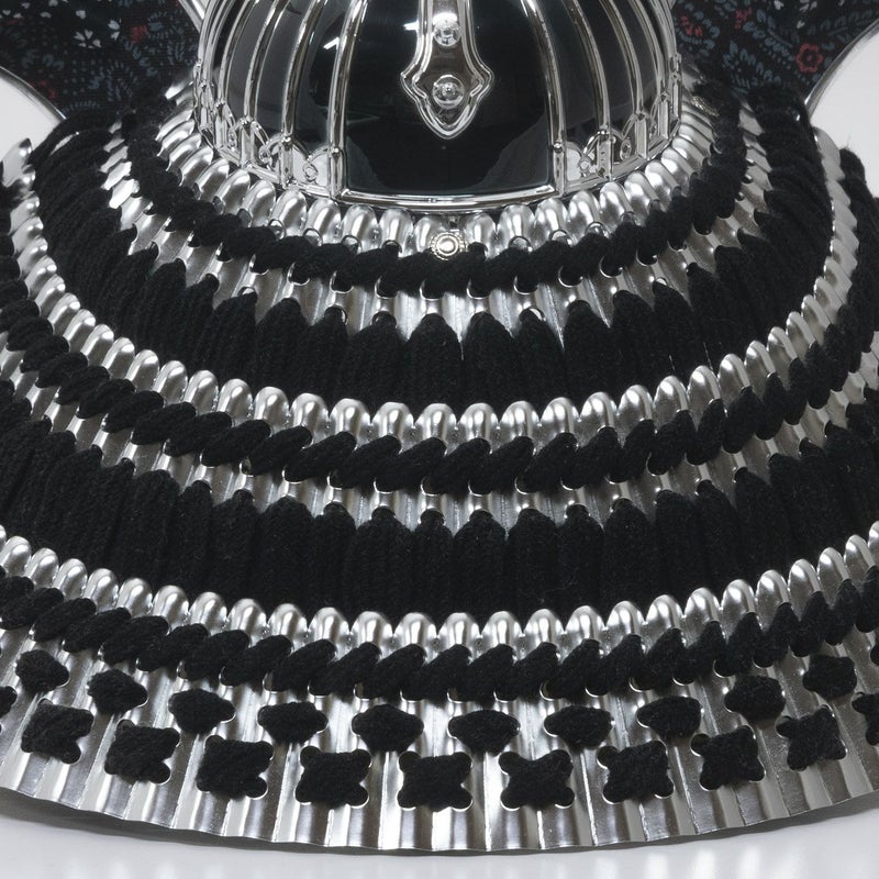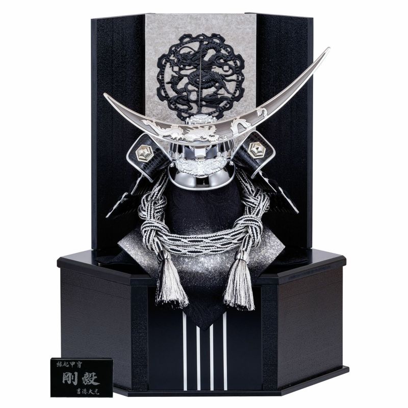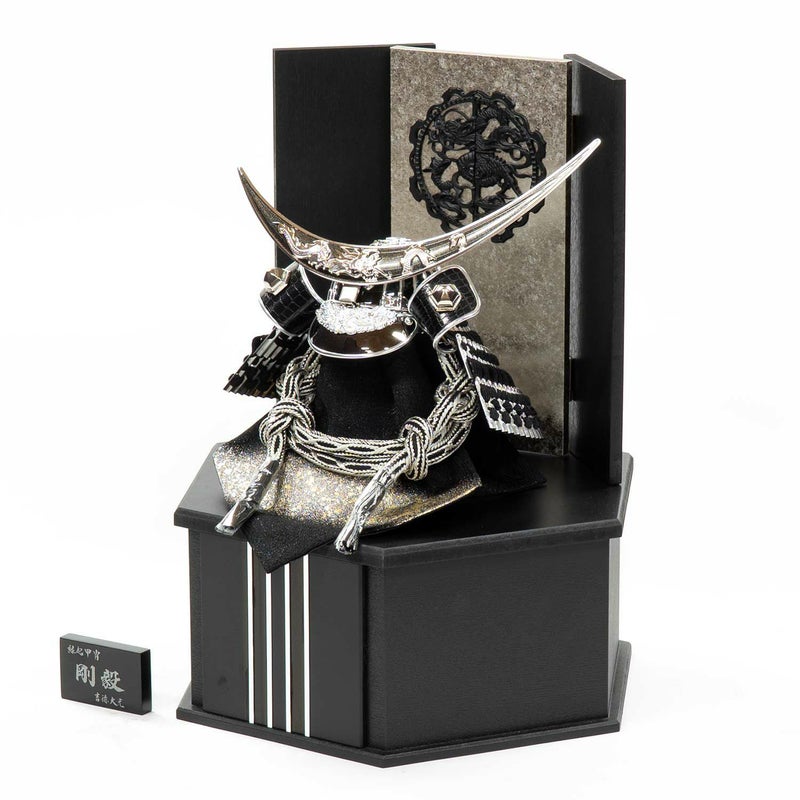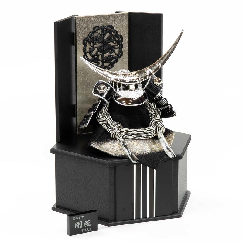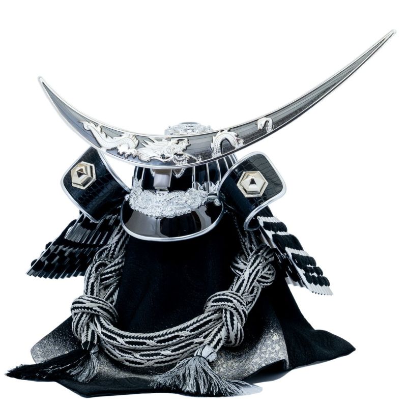 シルバーと黒のコントラストが美しい兜収納箱飾りです。