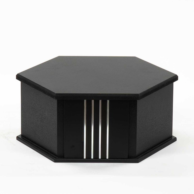 ■飾り台になる収納箱は六角形で、アクセントにシルバーのラインを入れました。