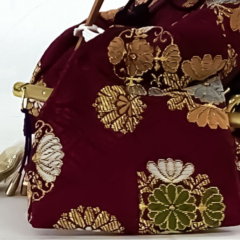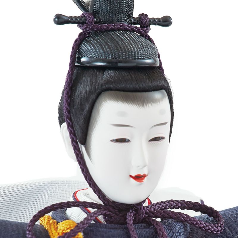 男性作家 秋葉 聡作の雛人形高貴な色とされる紫の金襴を男雛女雛双方に着せ付けた人形をセットした収納箱飾りです。台屏風を落ち着いた雰囲気のグレージュ色で仕上げ、お道具類は全体の雰囲気に調和するような仕上げをしました。特に、艶なしで仕上げた菱三宝は逸品です。