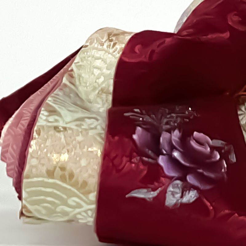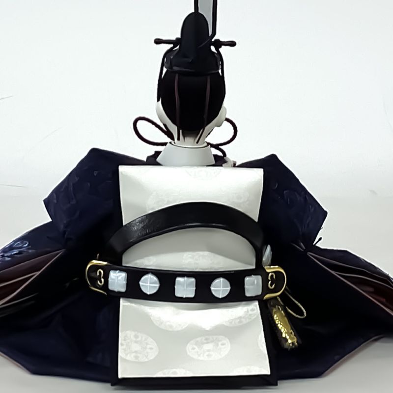 女性作家 柴田家千代作の雛人形人形のお衣裳はバラの柄が入った生地を着せ付けました。落ち着いた雰囲気の中にも高級感漂う親王飾りとなりました。京を感じる華やかな柄の屏風が印象的です。道具には唐草文様を施しました。唐草は生命力が強く、また、途切れることなく伸びていくその様子から“子孫繁栄”“長寿”の意味があります。