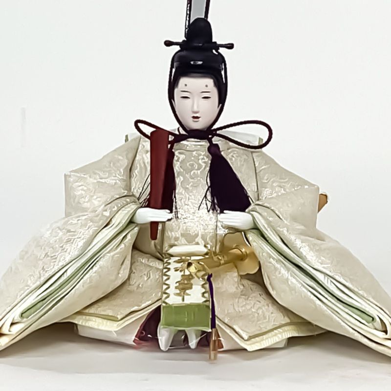 伝統的な趣に彩りが添えられた一品です。当社が自信を持っておすすめする「江都みやび」シリーズ。この江都みやびシリーズのお人形は、胴体部分に虫害の心配が少ない桐の木を使用し、これに木製の手を取り付けた仕様となっています。また、お人形の衣裳は、十二単(じゅうにひとえ)を模した6枚剥ぎ。本物の衣裳のように丁寧に仕立ててから着せ付けています。お人形の衣裳は、象牙色銀柄泊宝冠文様の正絹金襴を本式に仕立て丁寧に着せ付けました。流行に左右されない歴史の重みを感じられる、本物志向の一揃えです。