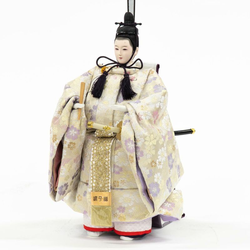 ■淡い色合いに花柄を織り出した衣裳を着せ付けた男雛。