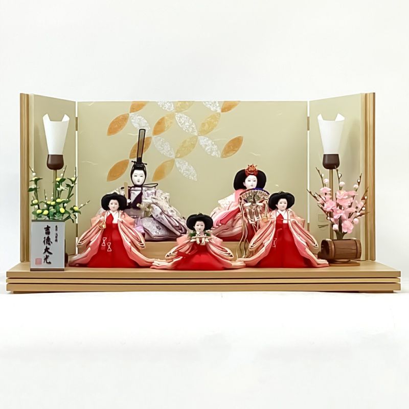 通常親王の2体を飾る台に三人官女もセットして、飾る場所を気にせず飾れるコンパクト五人飾りです。