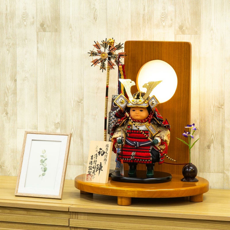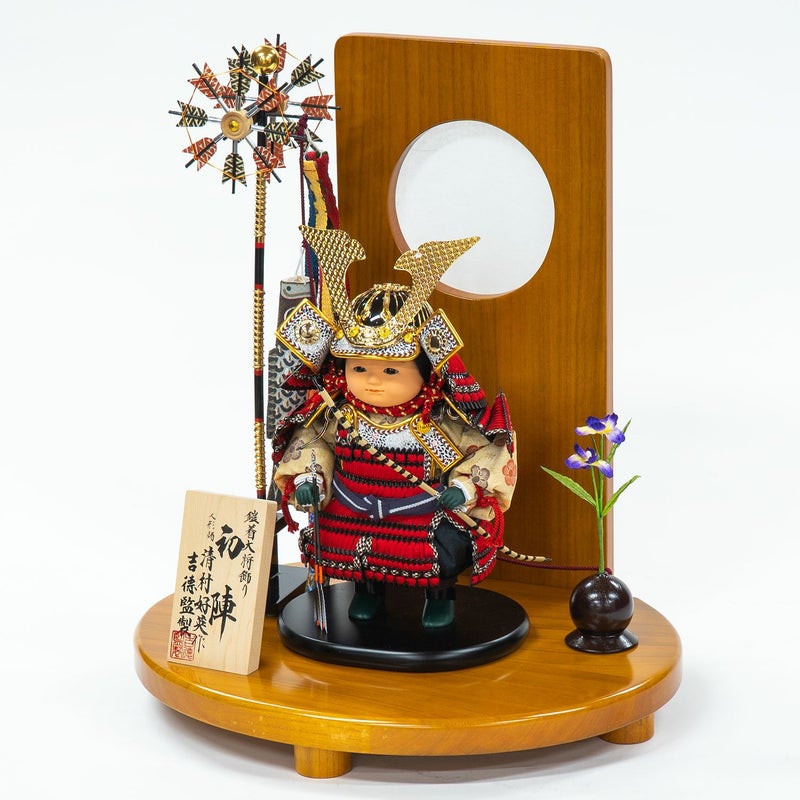 凛々しいお顔に赤絲縅の鎧を纏ったお人形を、優しい色合いの木目の丸台、衝立と組み合わせました。