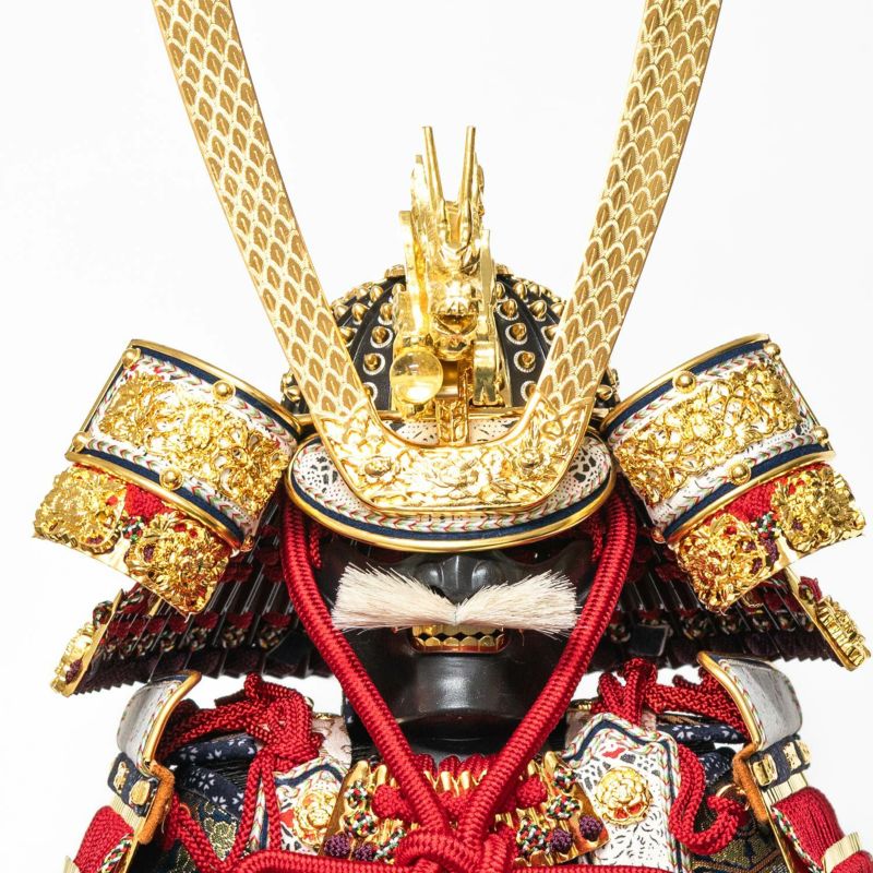 兜の鍬形純金鍍金仕上、龍頭は木彫金箔仕上、兜鉢は合わせ鉢仕様。