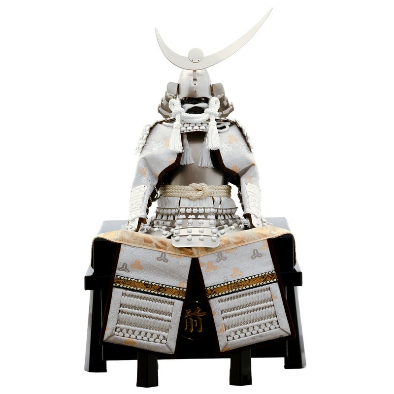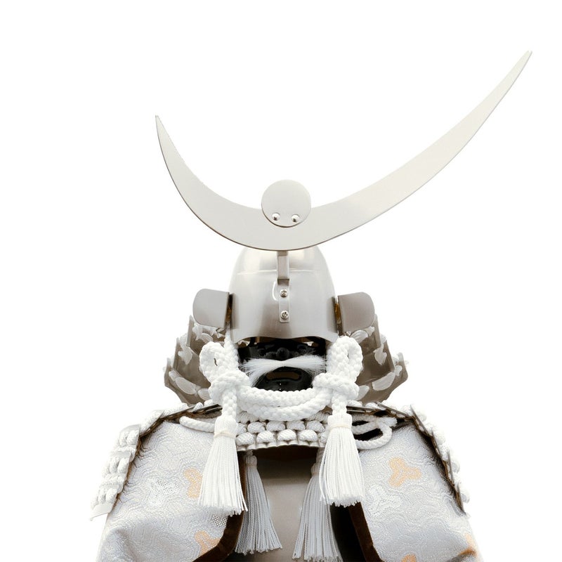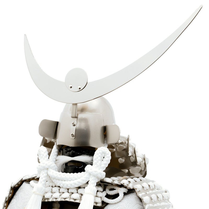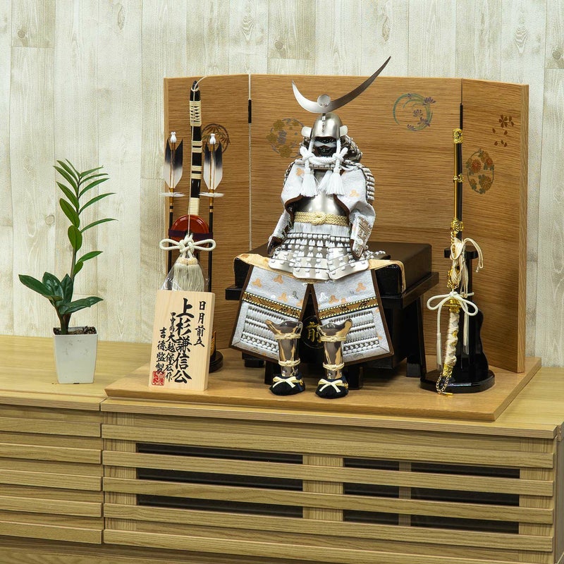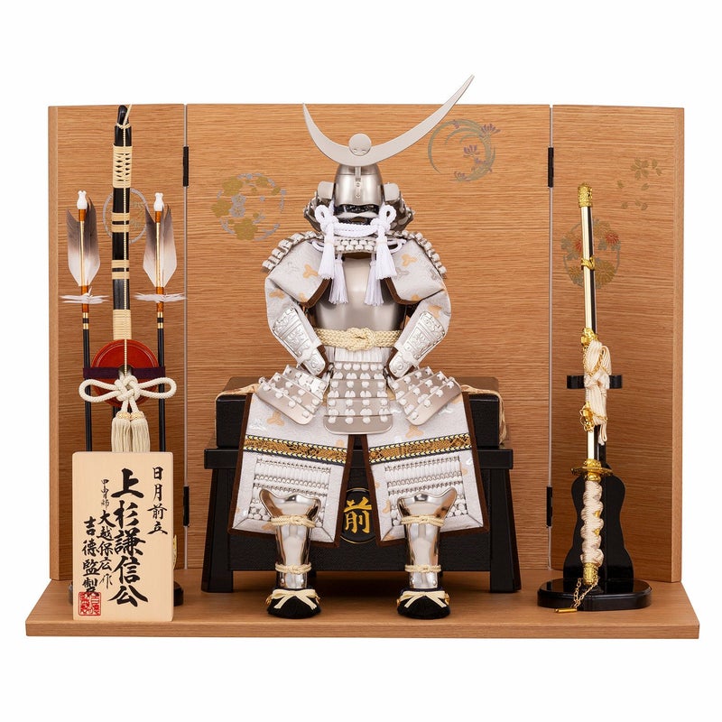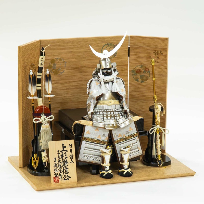 シルバーに白のコントラストが美しい、戦国武将・上杉謙信公の白絲縅の鎧飾り。
