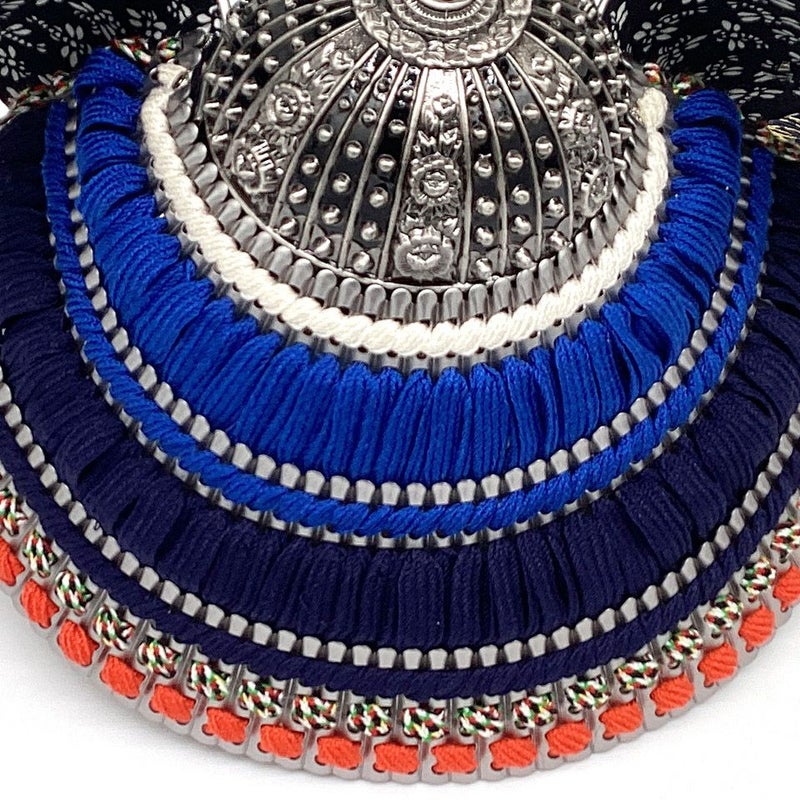 いぶし銀色の鍬形が特徴です。「小札」(こざね)または「札」とは、甲冑を構成している小さな短冊状の板のことです。また、絲(いと)でつなぎ合わせることを縅(おどす)すといい、その絲(いと)を縅絲(おどしいと)と呼びます。 この縅の色柄によって〇〇縅と呼ばれます。