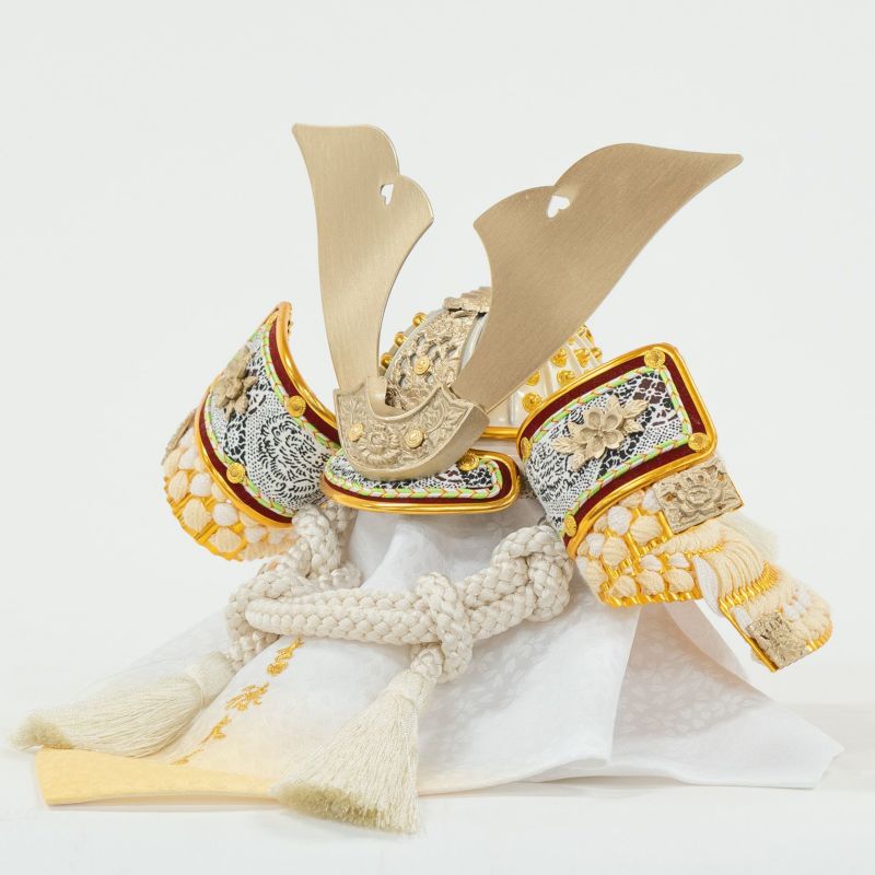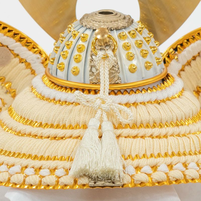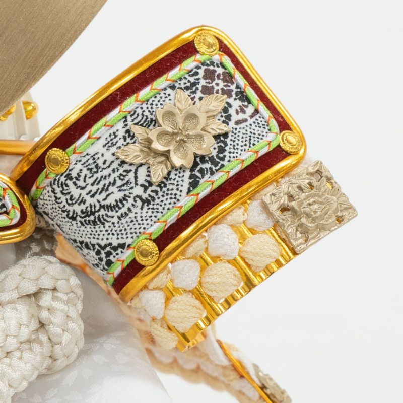 兜鉢は全体の雰囲気に合わせ白色を用い、吹返しには桜の金具を用い華やかさを出しました。
