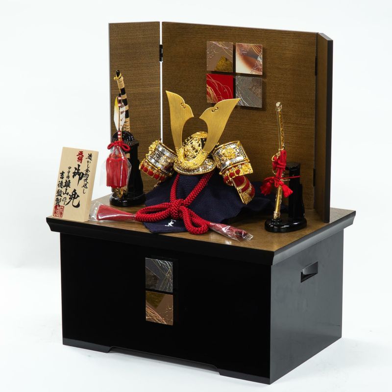 甲冑師雄山作の兜を、木目とレリーフの調和が美しい屏風と組み合わせた収納箱飾り。
