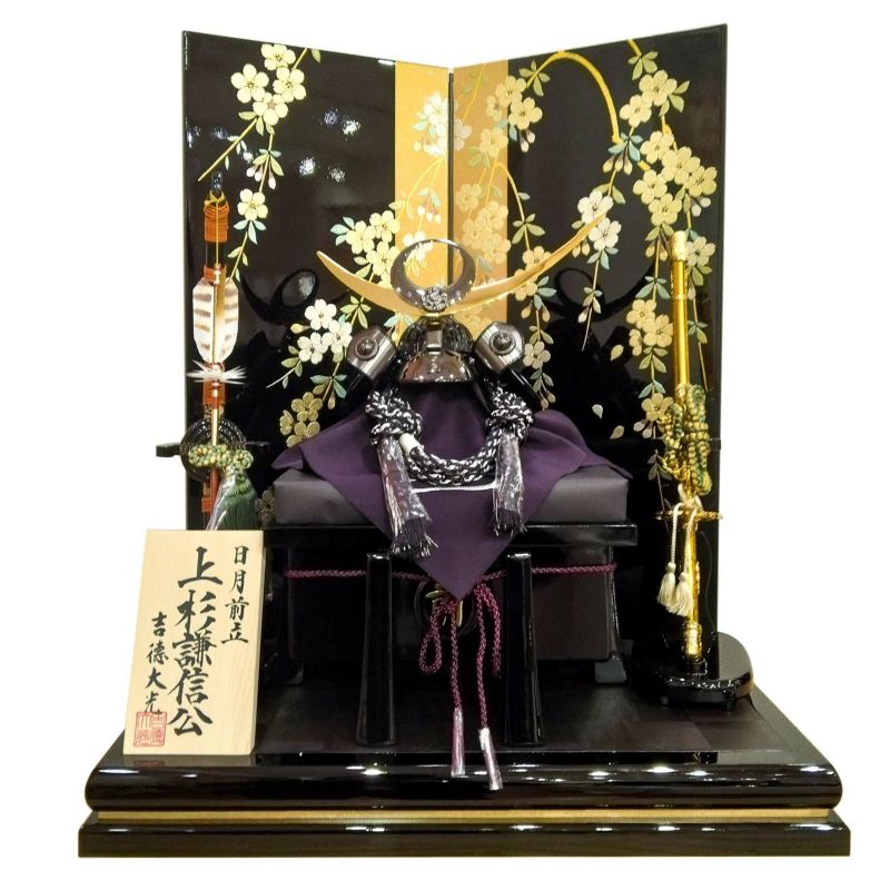 屏風は二曲に金彩で枝垂れ桜を描きました。華やかな中にも美しさが引き立つ上杉謙信公の兜飾りです。