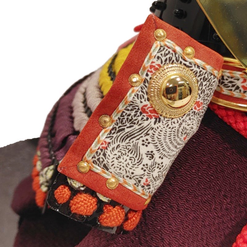 ■菖蒲の花の色である四色の絲を用いた、正絹紫裾濃縅(むらさきすそごおどし)、大鍬形の和紙小札1/4兜。