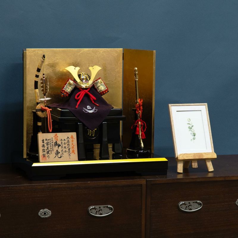 ■箔押しにコーティングを施した屏風がより一層兜を引き立てます。