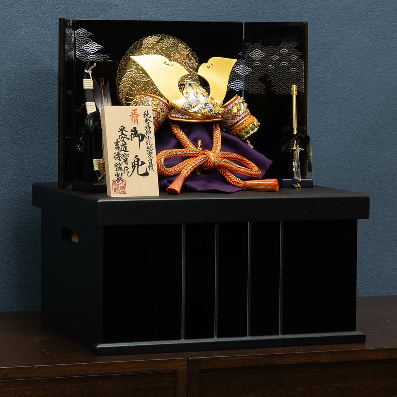 ■東京都知事認定伝統工芸士 平安 道齋作のフタ式兜収納箱飾り。