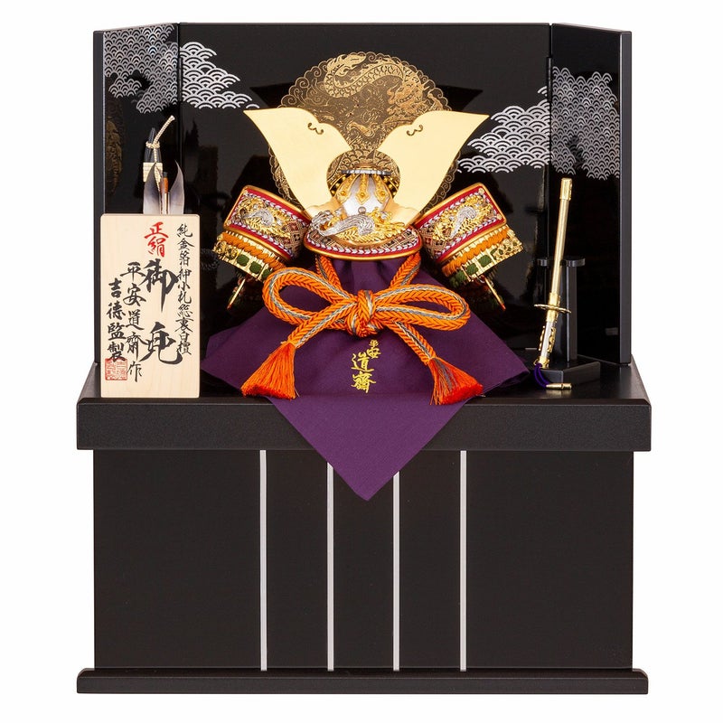 黒色の金彩で描いた「龍」の屏風がこだわりを持った兜をより一層引き立てます。