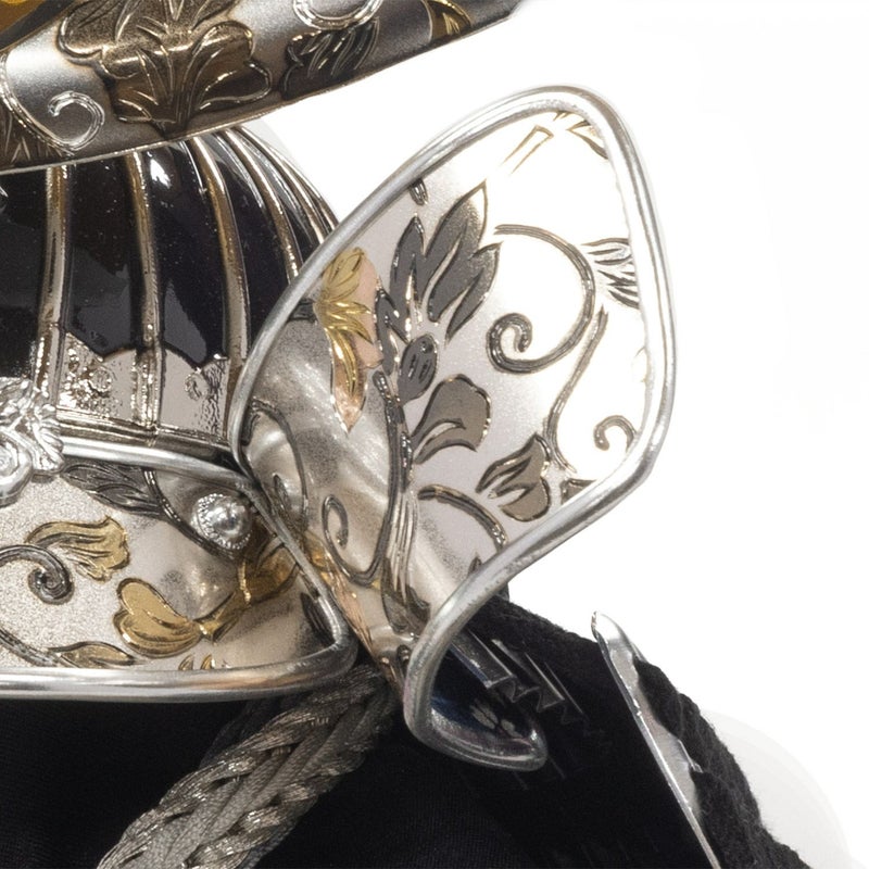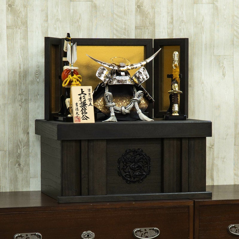 人気武将・上杉謙信公の兜に華やかな彫金加工を施し兜収納飾りです。