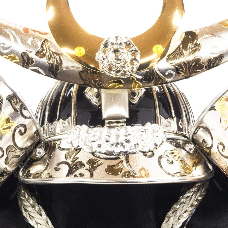■日月形前立、吹返しに子孫繁栄などの意味もある「唐草文様」を彫金で描きました。