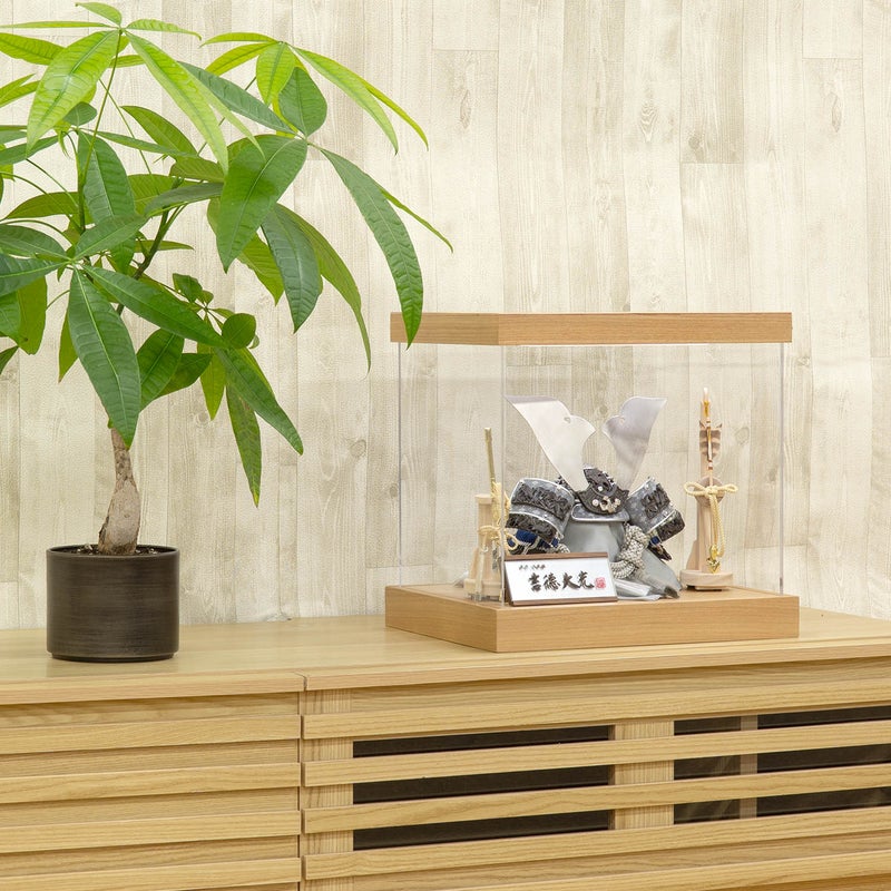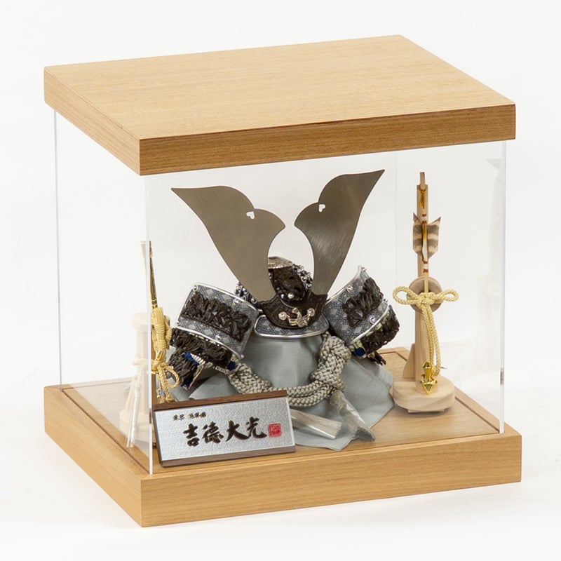 見るものを引き付ける、竹雀兜をアクリルケースと組み合わせました。