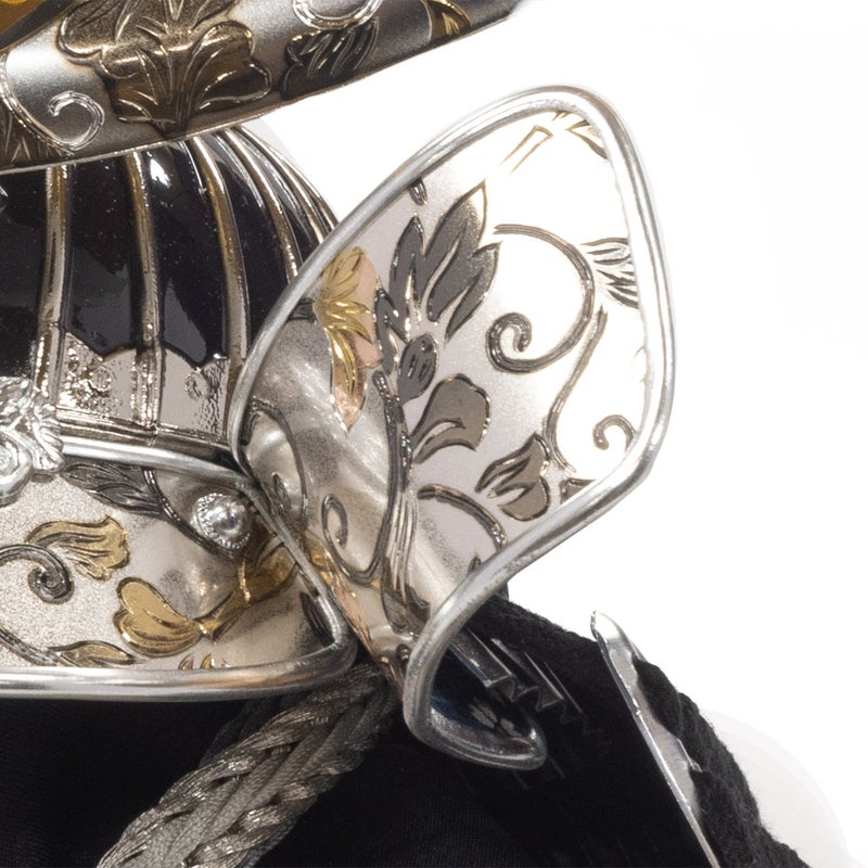 ■日月形前立、吹返しに子孫繁栄などの意味もある「唐草文様」を彫金で描きました。