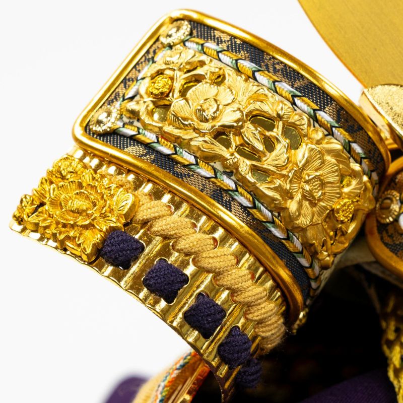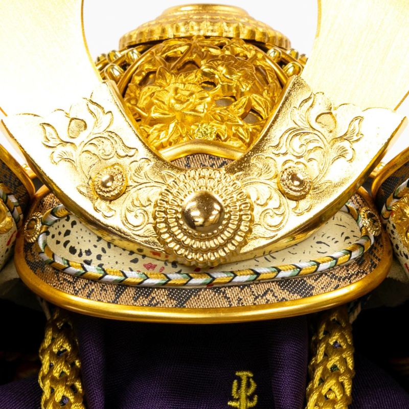 兜は箔押小札を使用。小札の裏には薄い箔を貼りその上から透き漆を塗った白檀塗(びゃくだんぬり)が施されており、手の込んだ造りとなっています。