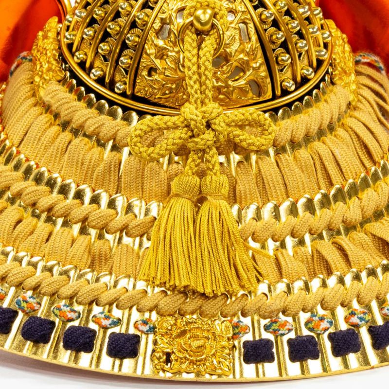 また、兜の縅絲は、正絹の緋絲を使用しました。屏風は、兜をより一層引き立たせるために、箔押の金屏風を用いました。