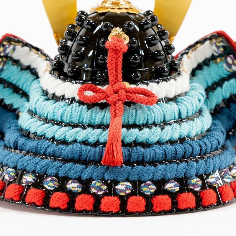 黒塗りの丸台に、1/5サイズの小柴鑚穂作の紺絲裾濃縅の和紙小札兜を組み合わせました。