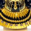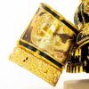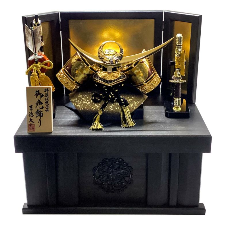 落ち着いた色合いの収納箱に金屏風を組み合わせた、名将上杉謙信の兜収納飾りです。