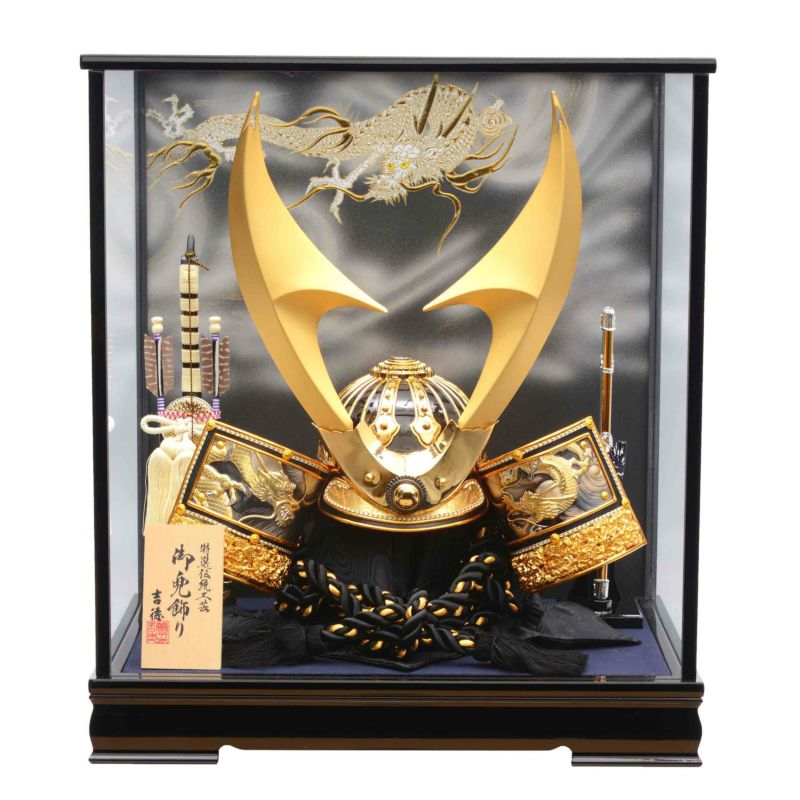 大鍬形を立体で仕上げた、ボリューム感のある着用兜ケース入り飾りです。
