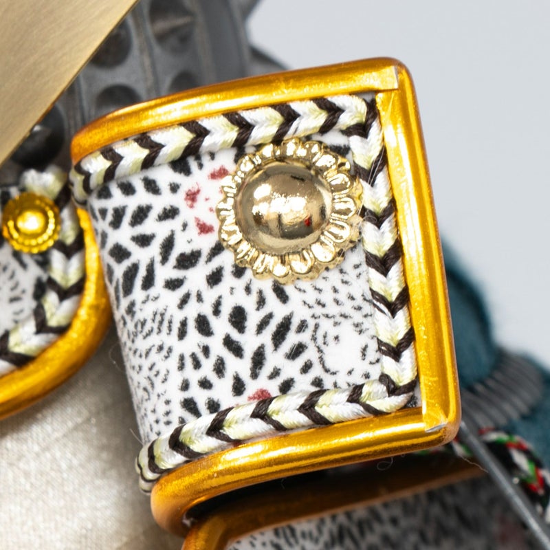 ■燻銀の小札に縹色(はなだいろ)と白絲縅のコントラストが美しい鎧。