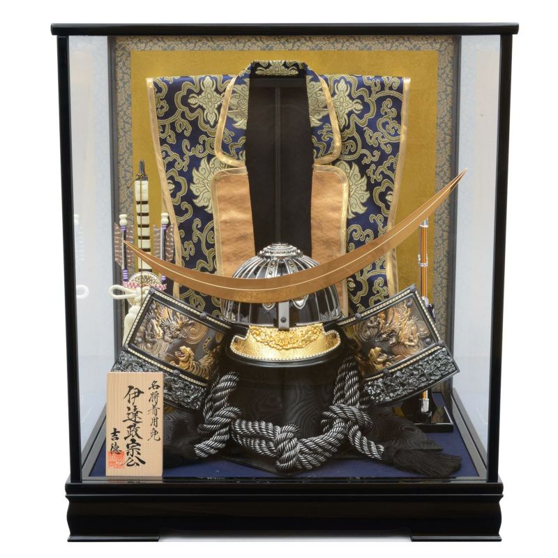伊達政宗公モチーフの兜と、落ち着いた色合いの陣羽織を実際に着用できるケース入り飾りです。