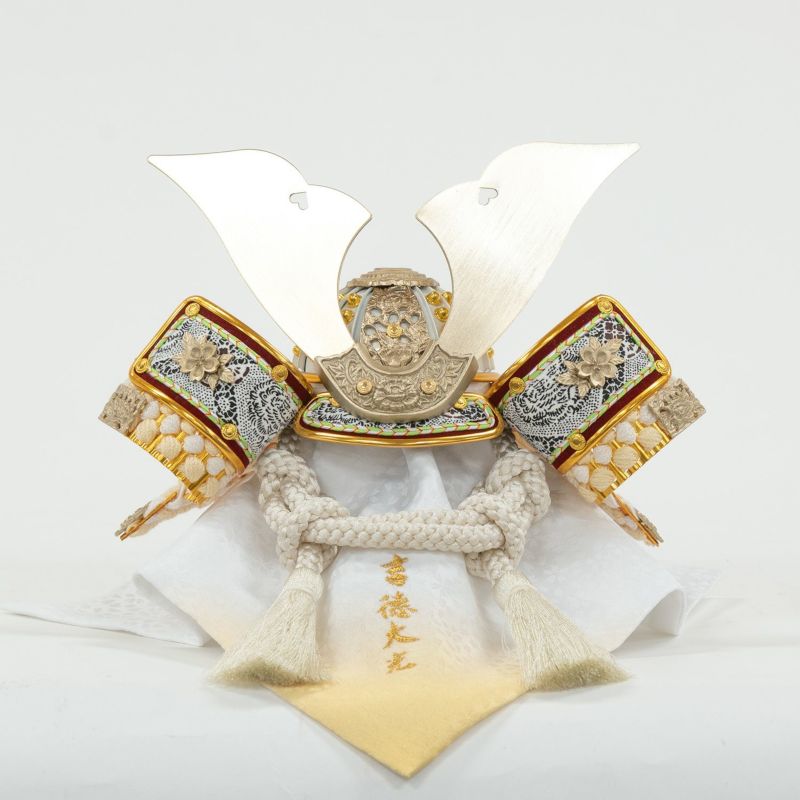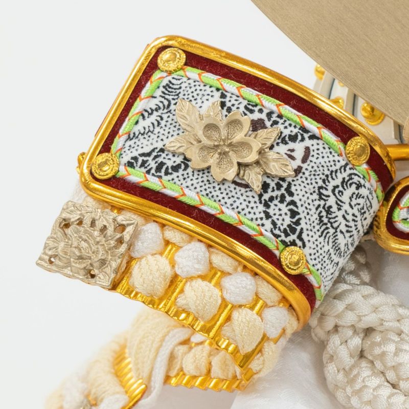 兜鉢は全体の雰囲気に合わせ白色を用い、吹返しには桜の金具を用い華やかさを出しました。