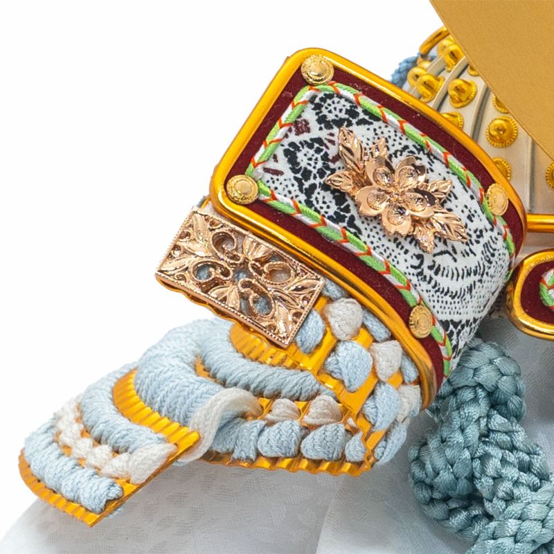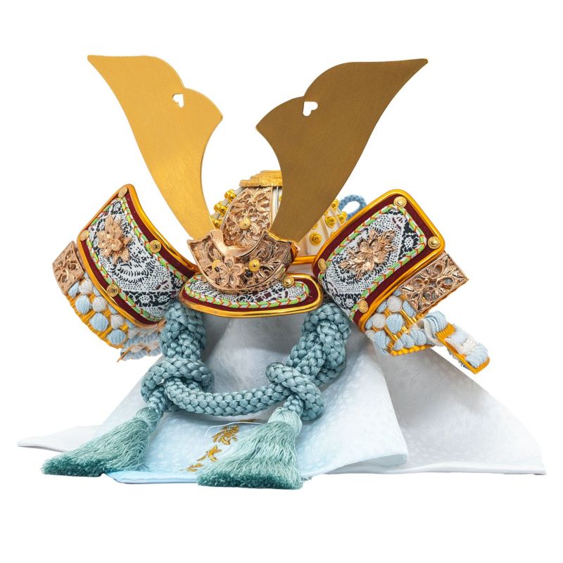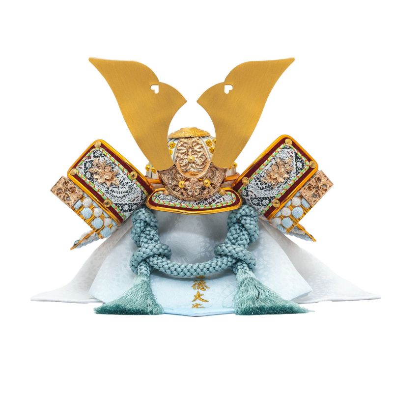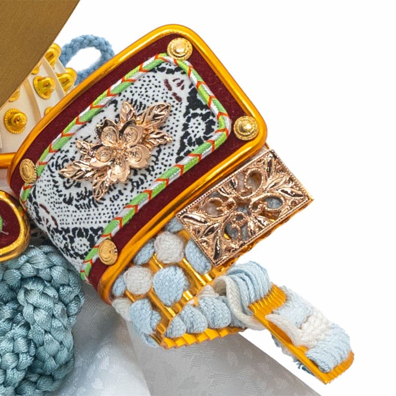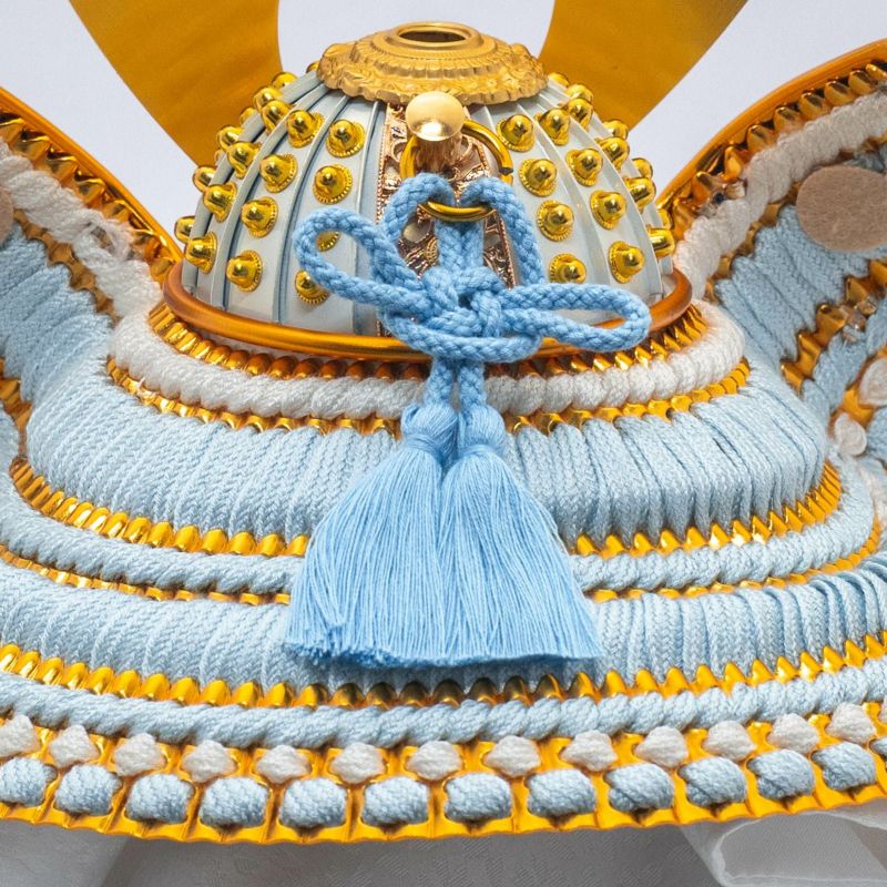 金の小札を用いた華やかな兜には、小川のせせらぎを想わせる淡い水色の縅絲を合わせました。