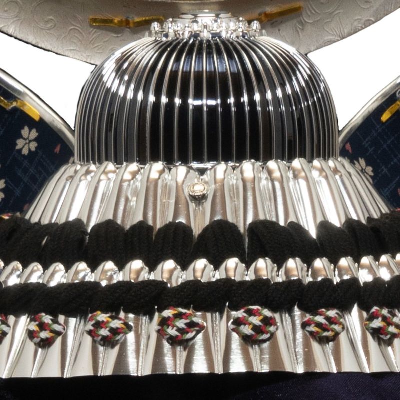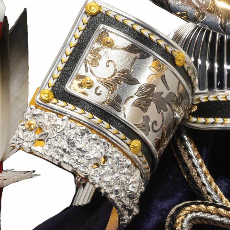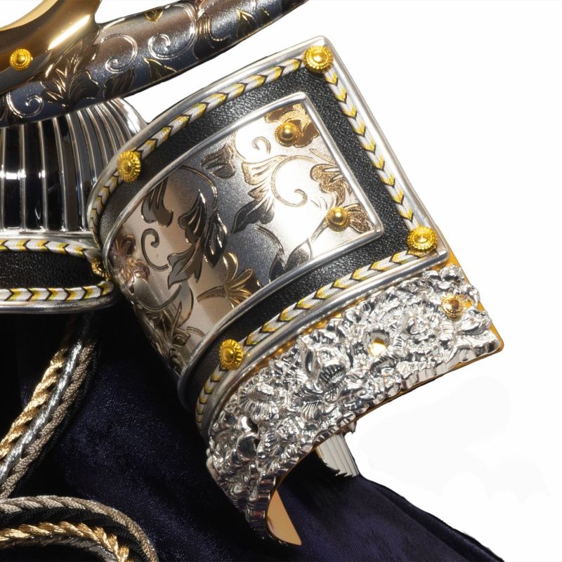 シルバーを基調とした兜の吹返し、前立には彫金で唐草文様を表現。