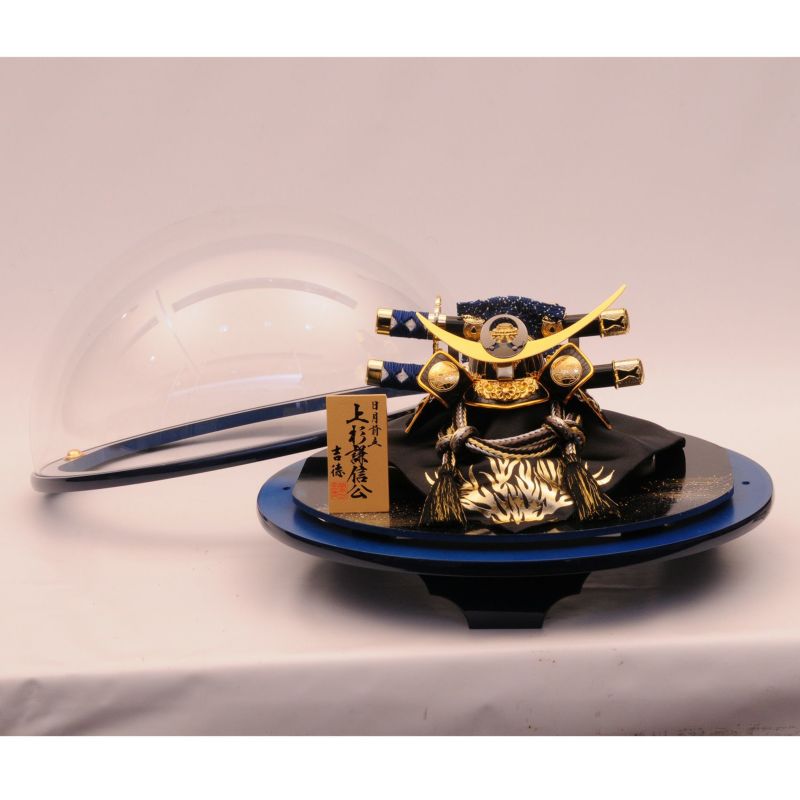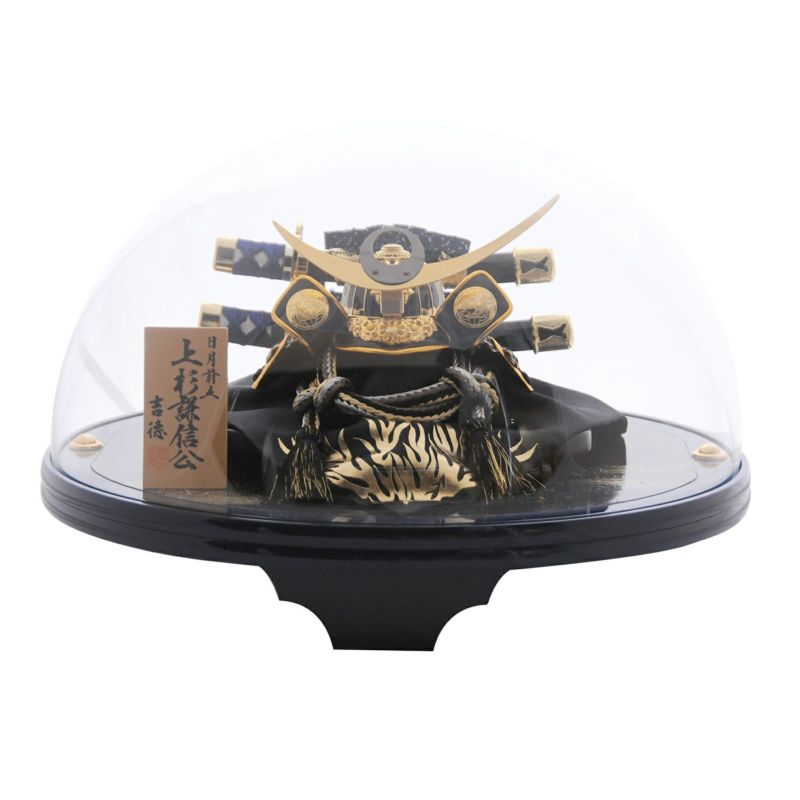 丸いドーム型ケースに上杉謙信公の兜を組み合わせました。