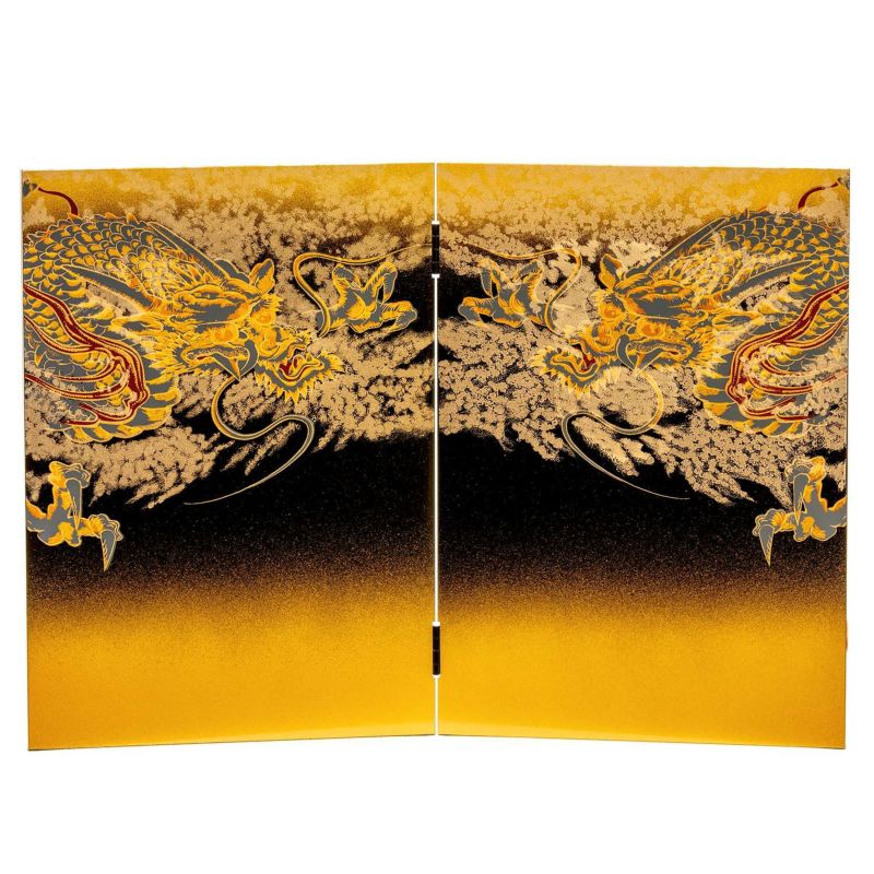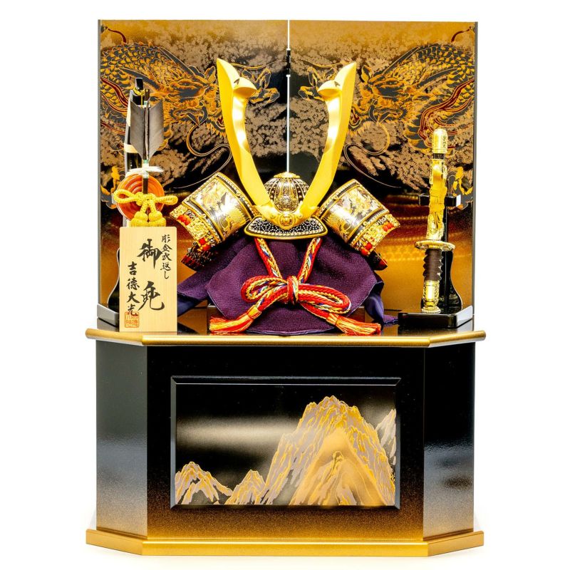 屏風に描いた迫力ある龍がより兜を引き立てる収納箱飾りです。