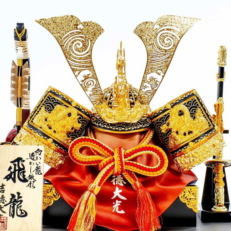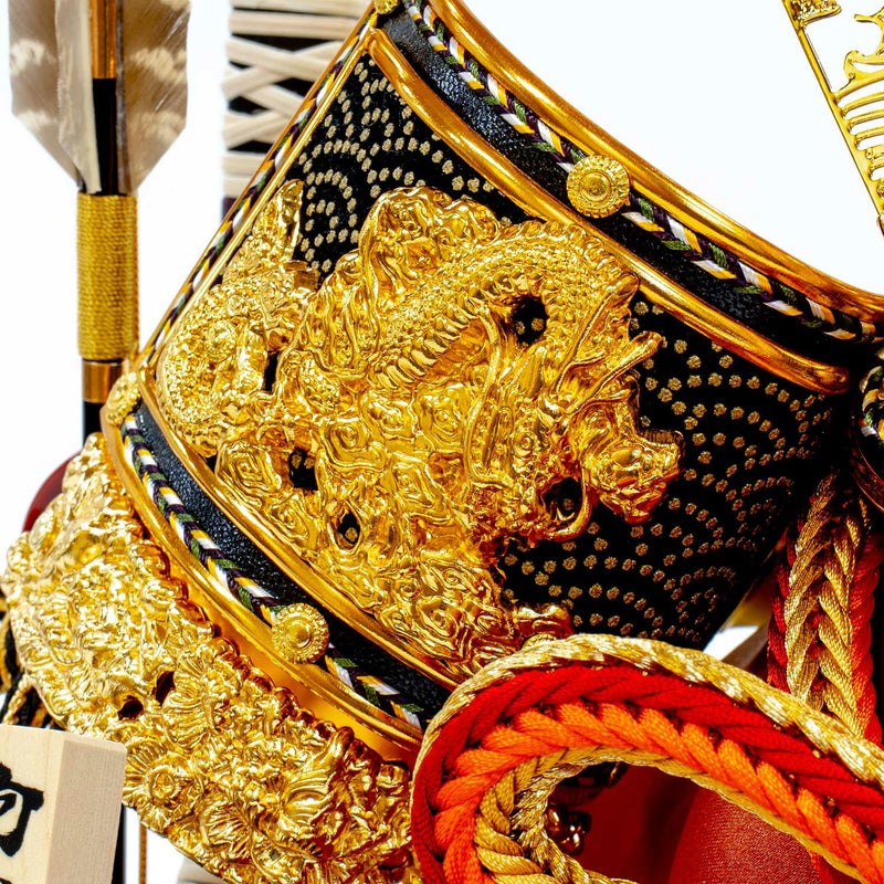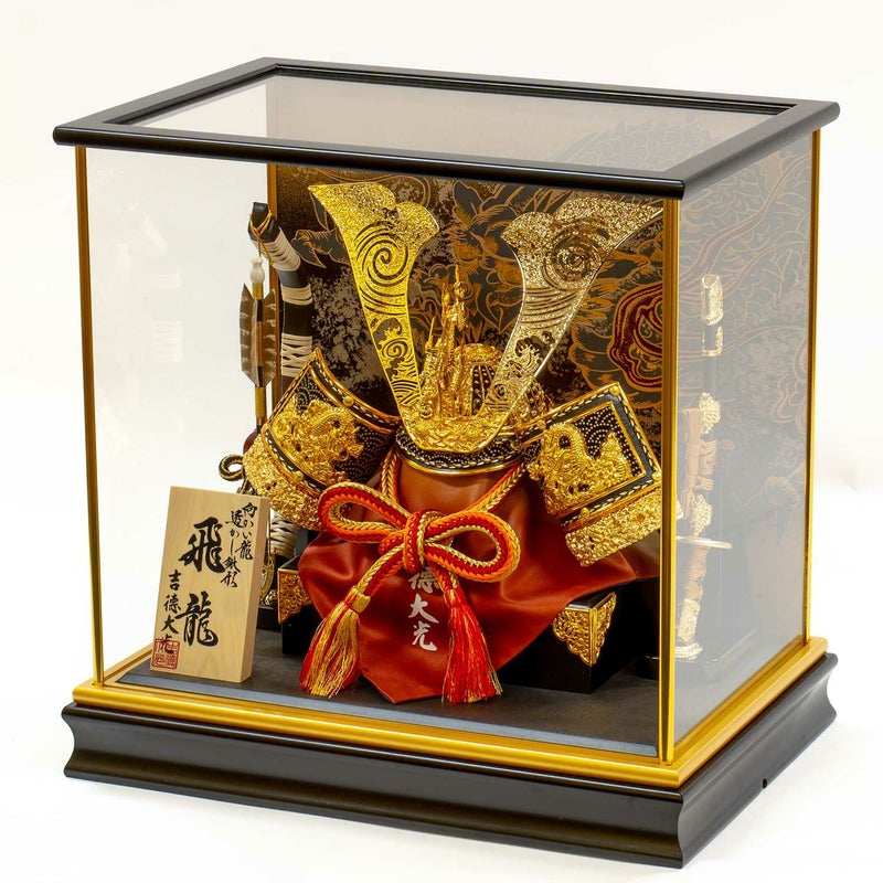 出世の象徴といわれる「龍」を描いた背景に、迫力ある兜を組み合わせたケース飾りです。